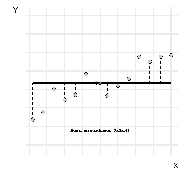 A animação abaixo mostra a reta de regressão assumindo diversos valores para \(\beta_{0}\) e \(\beta_{1}\). É importante observar que ela começa com uma reta na média de \(y\) e evolui até alcançar retas para além da mais adequada. Os valores da soma dos quadrados indicam que há uma inclinação que minimiza esse valor, enquanto inclinações anteriores ou posteriores fazem com que a soma dos quadrados aumente.