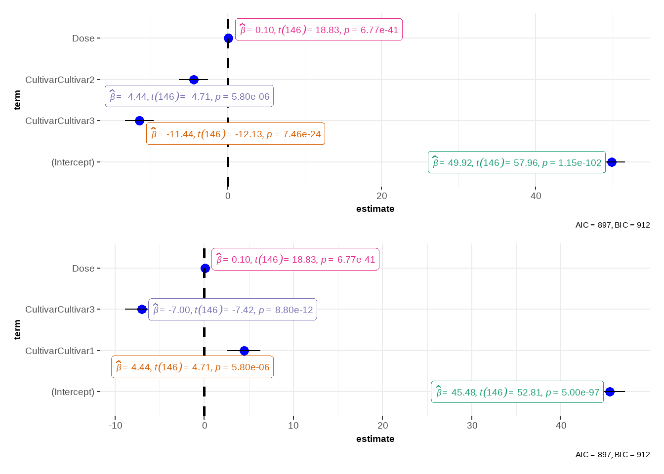 \[y= \beta_0 + \beta_1*dose + \beta_2*cultivar + \epsilon\]